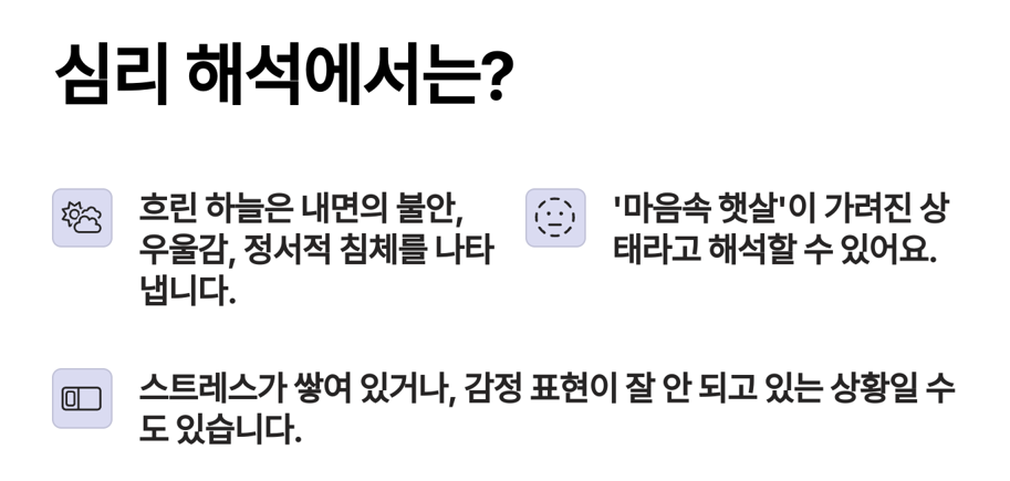 - 흐린 하늘은 내면의 불안, 우울감, 정서적 침체를 나타냅니다.